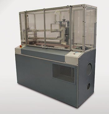 The cantilever mechanism and sample head can be moved across the abrasive belt to avoid testing on an already used part of the belt. To keep the belt free from debris during the test a large cylindrical rotating brush is in contact with the belt. A vacuum system fitted to the machine ensures the debris is removed safely.