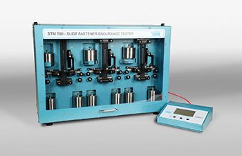 This machine tests zip (slide) fasteners and complies with SATRA Test Method 50:1992, Method 1.