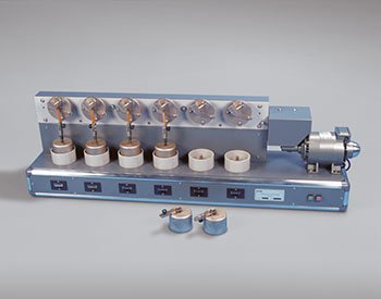 The six 10mm wide test pieces are clamped in the jaws and a 2 kilogram weight is suspended on the lower end. During the test, the jaws are rotated through 180° (90° each side of vertical) until the test piece breaks. Each sample has an individual counter which stops when the sample breaks. This indicates the number of flexes to failure of each test piece.